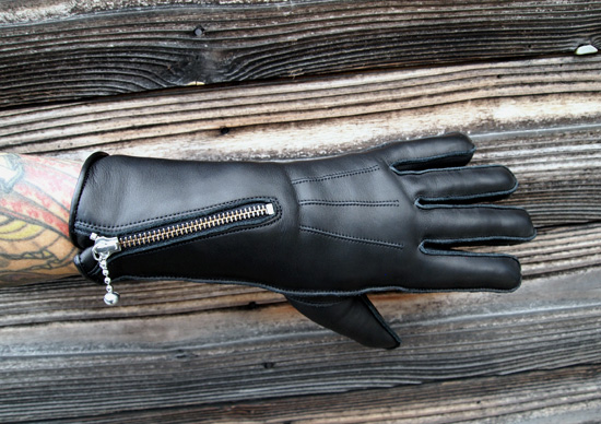 指先から裾まで、外は分厚い牛革、内はギッシリ密な羊毛。なのに着け心地はソフト。英国クラッシック・モーターサイクル・カルチャーが生んだ最強の防寒グローブ。手首を確りと締める事が出来るので、ジャケット袖口にインする事が可能です。