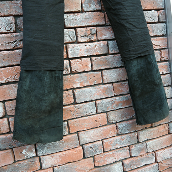 裾は、切りっぱなしの為、裾上げ加工も可能。オイルメンテ時に出来るだけ伸ばしましたが、裾から約7cm部分で折り目が付いています。