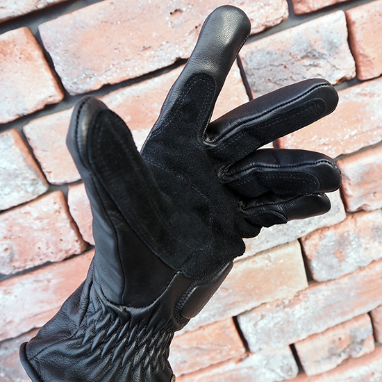 手のひらは、グローブ本体レザーの上から、スエードレザーで補強された、2重の革仕様!ダブルステッチで丁寧な縫製です。