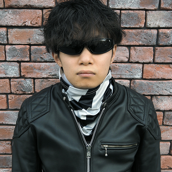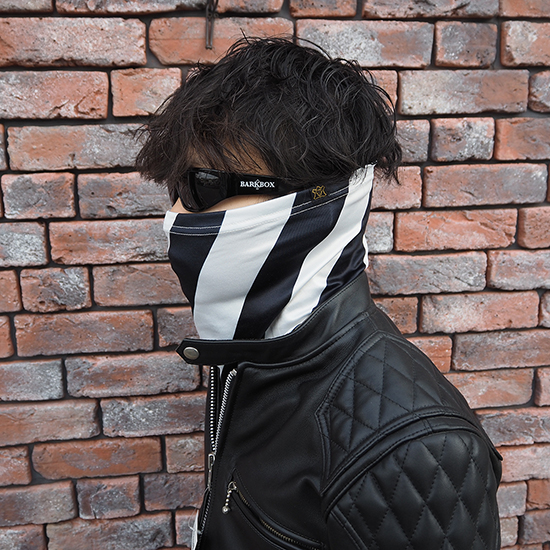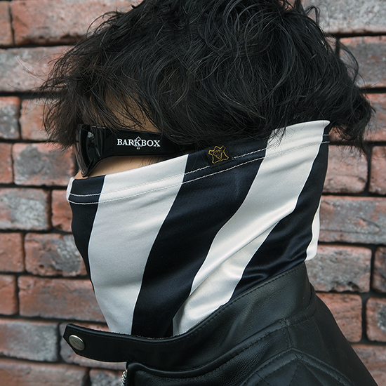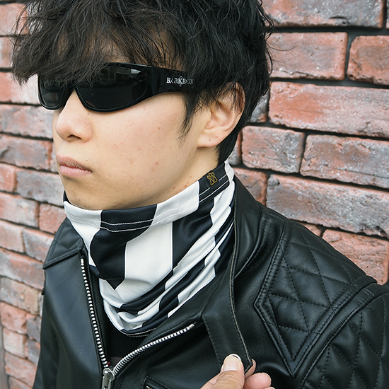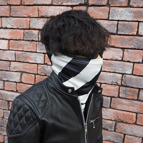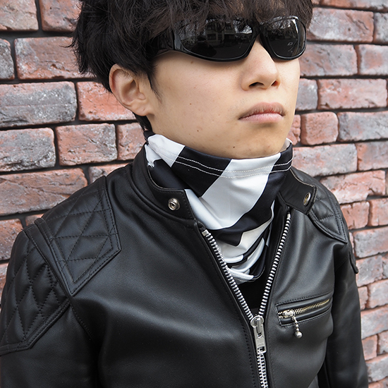 口を隠さず、首だけに巻き、レザージャケットと合わせて、バイクは勿論、街着として着用するもよし。